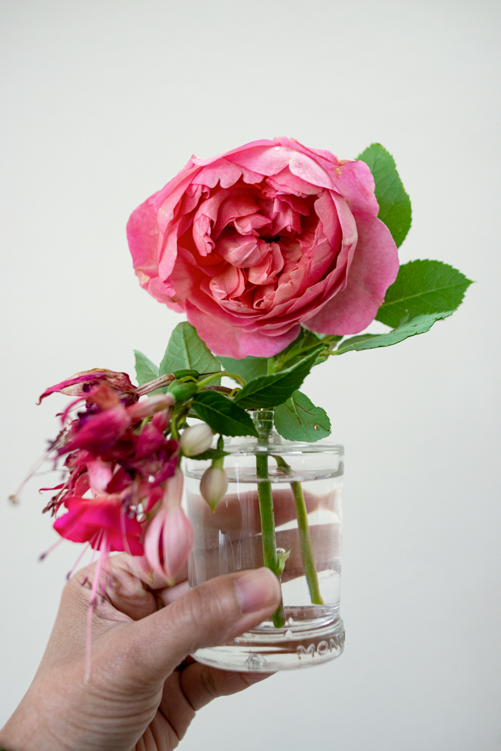 I decorated the living room with flower cuttings from our balcony garden, including roses and fuchsia. I placed single-flower vases and homemade potpourri, created from upcycled jars and bottles, around the living room.