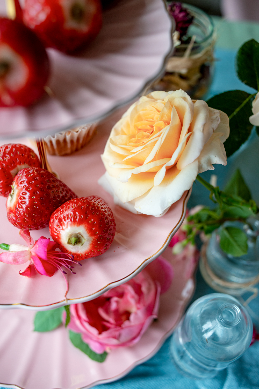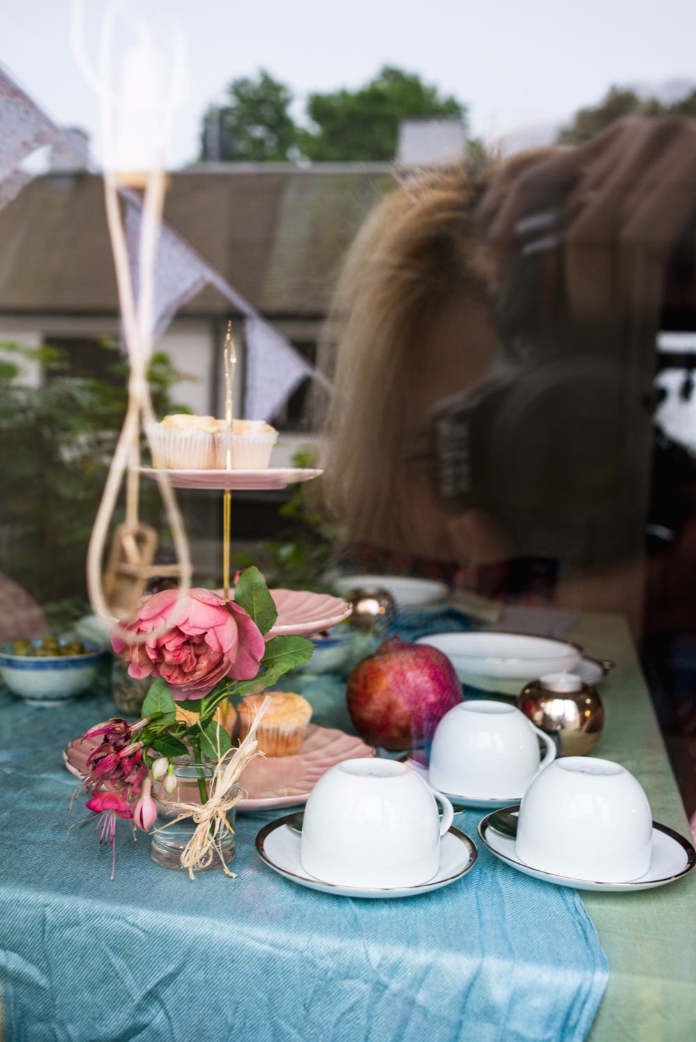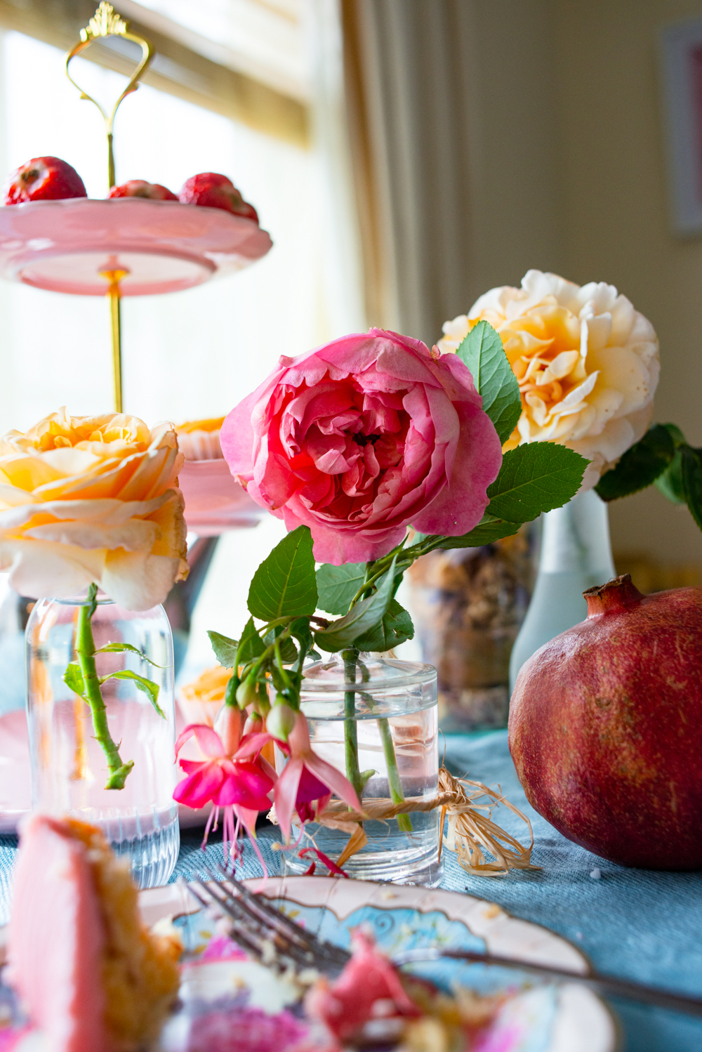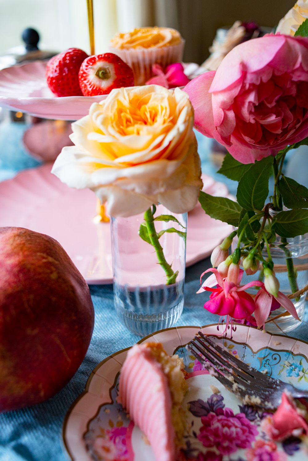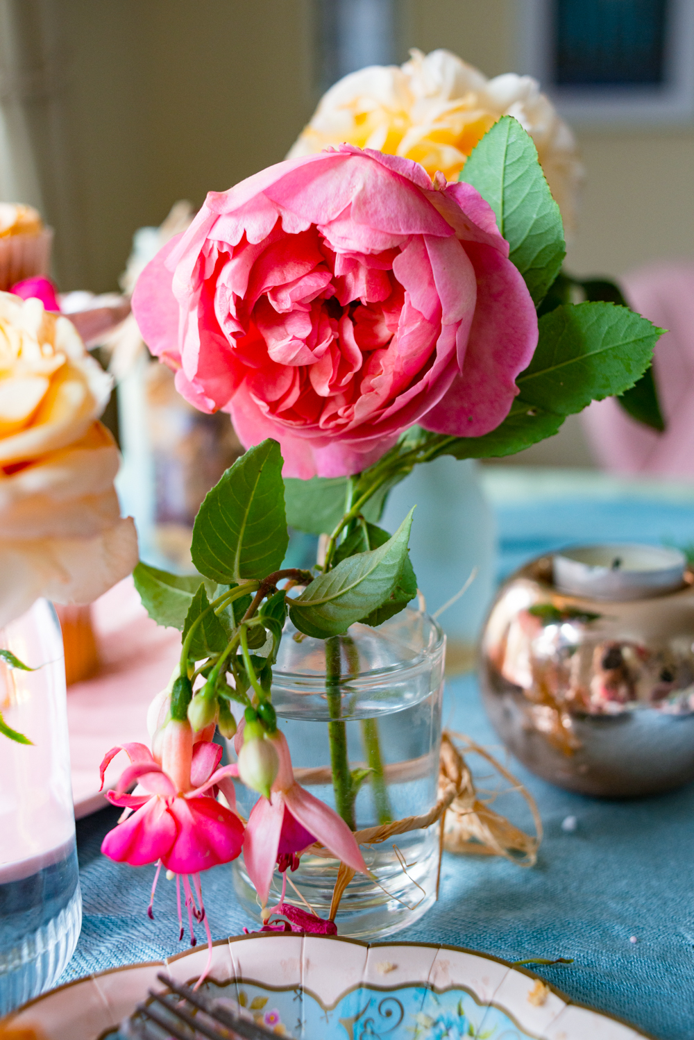 - Set a color theme. Pink tones dominated my tea party because we had rose and fuchsia cuttings from the garden. To complement the pink, I chose a bright blue tablecloth (repurposed from my scarf).