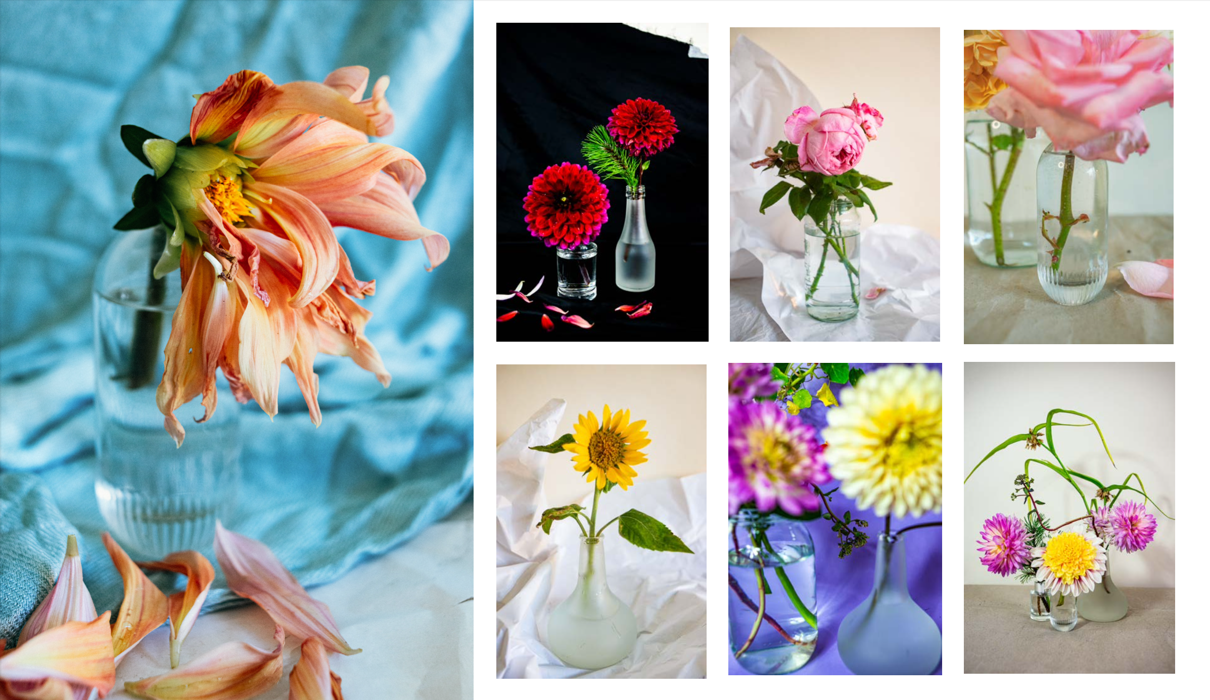 Exploring the power of objects, through the spontaneous compositions of seasonal flowers and discarded containers such as jars and bottles. The focus on the concept of destruction, creation and longevity, inspired by Eastern art philosophy.